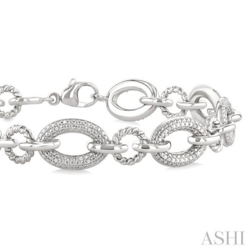 A testament to subtle luxury and enduring style, this diamond bracelet is destined to become a signature accent with every wear. Embodying the essence of refined contrast, it marries bold contours with delicate sparkle. 8 bold oval links, each adorned with 4 pave set round cut diamonds, total 32, alternate with 8 sleek, rope-textured circular links to form a rhythmic chain of metal and light. Plain silver D-link connectors join each element, allowing the bracelet to drape fluidly across the wrist. A lobster-clasp closure ensures a secure fit. The diamond bracelet is fashioned in rhodium finish silver. Total diamond weight is 1/10 Ctw.