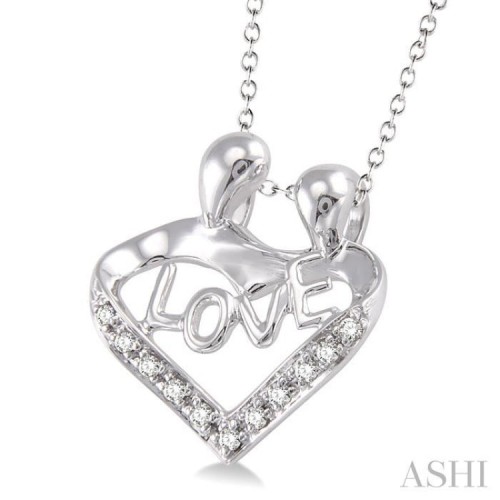 Show your mom that you love and respect her the most with this captivating child and mother pendant crafted in gleaming sterling silver. This heart shape designed pendant showcases ‘LOVE’ written within and embellished with 11 alluring pave set round cut accented diamonds. The pendant suspends from a graceful Cable Chain 1.00 MM in 18 Inches with Spring Lock & Extenders at 16″ & 17″. The total diamond weight is 1/20 Ctw.