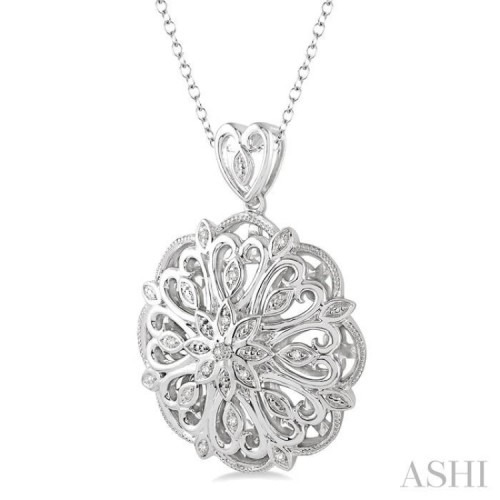 A lovely design, this pendant complements any look. Fashioned in sterling silver this circle shaped pendant features an intricate filigree heart design embellished by 12 shimmering pave set round cut diamond accents. This pendant hangs from a shining Cable Chain 1.00 MM in 18 Inches with Spring Lock & Extenders at 16″ & 17″. The total diamond weight is 1/20 Ctw.