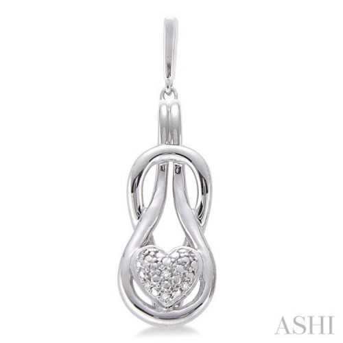 Delight her with the elegance of these sparkling heart shaped diamond earrings. Fashioned in smooth sterling silver these interlocked tear drop designed earrings are adorned with 8 gorgeous prong set round cut inset diamonds in heart motif. These lovely treats close with earnut backs. The total diamond weight is 1/50 Ctw.