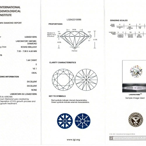 1.64c LAB CREATED DIAMOND CERTIFIED E VS1 3X EXCELLENT CUT ROUND BRILLIANT 1.5ct