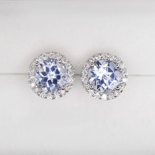 These elegant floral stud earrings feature bright blue aquamarines surrounded by diamond encrusted flower petals!