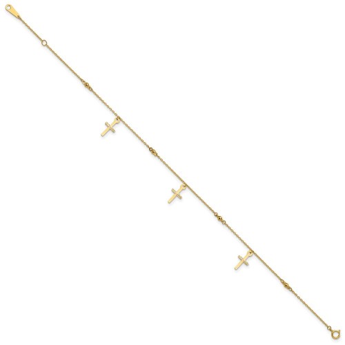 14k Polished Diamond-cut 3 Cross Dangles and Beads Anklet Plus Extender 9in