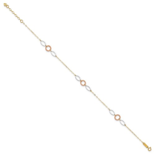 14k Tri-color Circle and Oval 3-Station Anklet Plus Heart Dangle Extender 10in