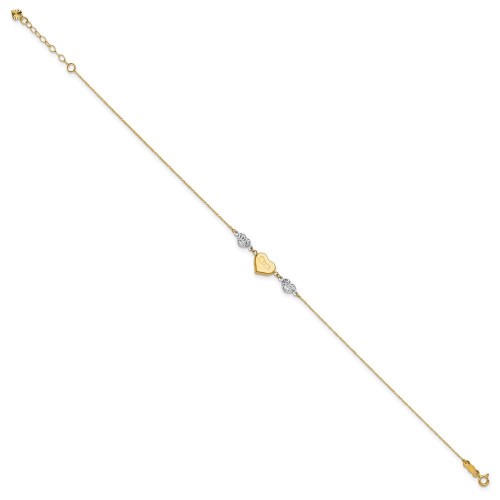 14K Two-tone Diamond-cut and MOM Puffed Heart Anklet Plus Heart Dangle Extender 9in