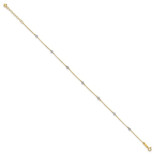 14K Two-tone Diamond-cut Beads 7-Station Anklet Plus Heart Dangle Extender 9in