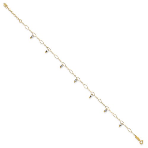 14K Two-Tone Mirror Bead Dangles Anklet Plus Heart Dangle Extender 9in