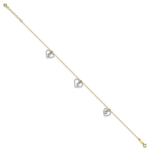 14K Two-tone Twisted Diamond-cut 3 Heart Dangles Plus Extender – Total Anklet 9in