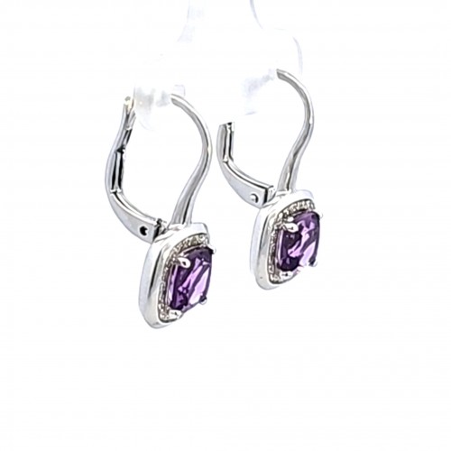 Discover the allure of these elegant amethyst and diamond earrings, designed to add a touch of sophistication to any outfit. The stunning amethyst stones are beautifully framed by sparkling accents, making them perfect for both casual and formal occasions. These earrings feature 1.80 carat total weight of cushion cut amethysts and .15 carat total weight of diamonds, set in 14K white gold.