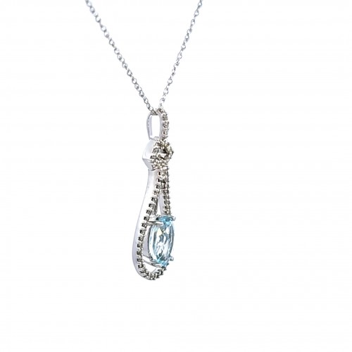 This stunning teardrop pendant necklace features a captivating 1.10 carat oval aquamarine gemstone, elegantly surrounded by .22 carat total weight of sparkling diamonds. Crafted with precision, it adds a touch of sophistication to any outfit, making it perfect for both casual and formal occasions. The pendant is suspended from an eighteen inch light rope chain.