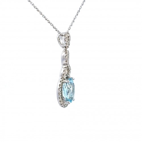 Discover the allure of this stunning 1.10 carat oval aquamarine pendant, elegantly suspended from a delicate eighteen inch light rope chain. The intricate design features .26 carat total weight of sparkling diamond accents that enhance the beauty of the central stone, making it a perfect accessory for any occasion.