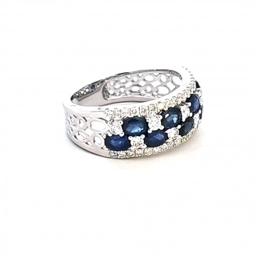 Discover the exquisite beauty of this elegant 2.30 carat total weight blue sapphire and .60 carat total weight diamond ring. Crafted with precision in 14K white gold, it features a stunning arrangement of deep oval blue sapphires interspersed with sparkling diamonds, creating a captivating contrast that catches the eye. Perfect for special occasions or as a luxurious everyday accessory, this ring embodies sophistication and style.