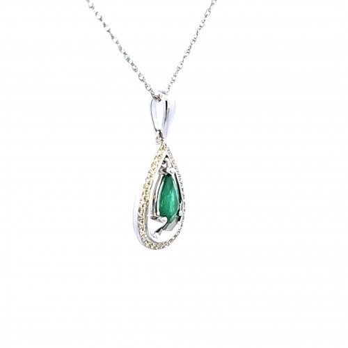 This stunning 14K white gold emerald pendant necklace features a beautifully cut .68 carat pear shape emerald, surrounded by a delicate halo of .10 carat total weight of sparkling diamonds. The intricate design and high-quality craftsmanship make it a perfect accessory for any occasion, adding a touch of elegance to your outfit, and includes a delicate 18 inch light rope chain.