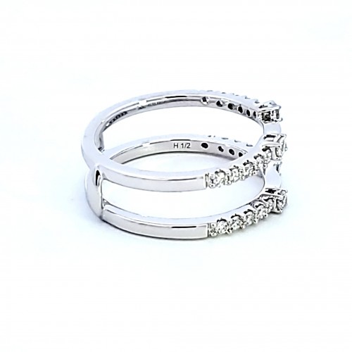 This stunning .45 carat total weight wedding band has twelve full cut diamonds to each side of the band. The diamonds are all prong set and the band is made of 14K white gold. This band is designed to be worn with an engagement ring.