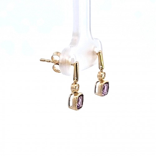 These stunning drop earrings feature exquisite amethyst stones, elegantly set in a delicate 14K yellow gold frame. The rich purple hue of the amethyst adds a touch of sophistication, making them perfect for both casual and formal occasions. These earrings feature .30 carat total weight of square cushion Amethysts and .03 carat total weight of diamonds.