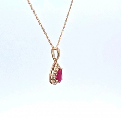 This stunning .50 carat pear ruby pendant necklace features a beautifully crafted teardrop design, surrounded by .12 carat total weight of sparkling diamond accents. The rich red hue of the ruby is complemented by the delicate 14K yellow gold light rope chain, making it a perfect accessory for any occasion. Elevate your jewelry collection with this exquisite piece that radiates elegance and charm.