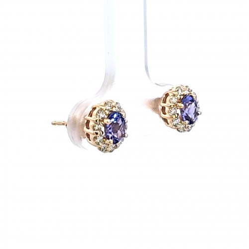 These stunning earrings feature a vibrant purple Tanzanite surrounded by a delicate halo of sparkling accents. Perfect for adding a touch of elegance to any outfit, they are ideal for both casual and formal occasions. Crafted with precision, these earrings are a must-have for any jewelry collection. The .70 carat total weight of oval tanzanites and .45 carat total weight of diamonds are set in a 14K yellow gold setting.