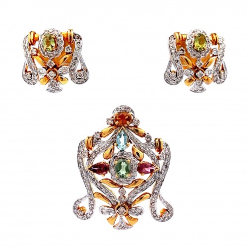 18K White Yellow Gold Necklace Earring Set with Natural Diamond & Pink Tourmaline Jewelry