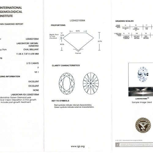 This mesmerizing 2.72ct certified lab grown oval diamond has excellent clarity, bright white color, and displays absolutely phenomenal sparkle! Oval cuts are one of the most fashionable and sought after diamond cuts, and this cut is well executed with dazzling sparkle throughout.