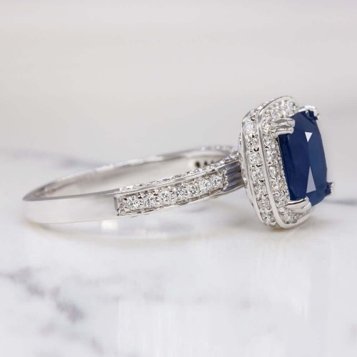 This striking and high quality sapphire and diamond ring has an eye catching, glamorous design featuring a royal blue sapphire in a luxurious, diamond encrusted 14k white gold setting! The 2.35ct cushion cut sapphire center is a gorgeous royal blue color. It is a beautiful true blue that is perfectly set off by the diamond accents. The elegant and luxuriously substantial setting is encrusted with diamonds, so it sparkles from all angles. It is a positively dazzling effect!Utterly classic and rich with color and brilliance, this sapphire and diamond ring is an excellent choice for a right hand ring or alternative engagement ring.