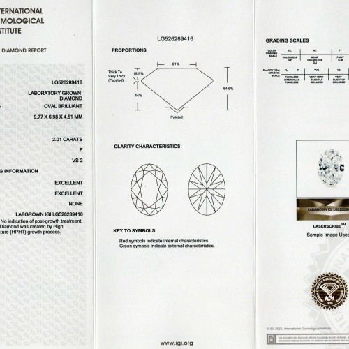 This striking lab grown diamond is certified by IGI, one of the strictest grading labs in the world. Under IGI’s rigorous standards, the diamond is graded VS2 for clarity. The diamond is impeccably clean even under 10x magnification! Graded F for color, it is colorless and faces up beautifully white. Its sparkle is dazzlingly bright and lively with stunning and vividly colorful flashes of fire! The diamond has a stunning look with mesmerizing and lively sparkle, and it is very fashionable with its popular and flattering oval shape. With its beautiful white color, completely clean appearance, and great sparkle, this diamond is a perfect choice for an engagement or right hand ring!