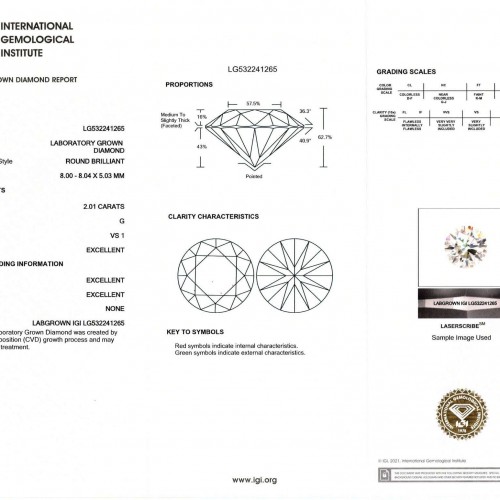 This striking lab grown diamond is certified by IGI, one of the strictest grading labs in the world. Under IGI’s rigorous standards, the diamond is graded VS1 for clarity. The diamond is impeccably clean, even under 10x magnification. Graded G for color, it faces up beautifully white. Its sparkle is dazzlingly bright and lively with stunning and vividly colorful flashes of fire! With its beautiful white color, completely clean appearance, and great sparkle, this diamond is a perfect choice for an engagement or right hand ring!