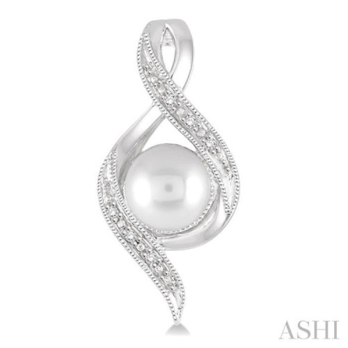 These Cultured Pearls and diamond earrings make for a stylish statement. Crafted on the lustrous beauty of sterling silver these earrings are adorned with a large prong set Cultured Pearls and embellished with 12 pave set round cut diamonds in infinity frame. The earrings close with secure clasp. The total diamond weight is 1/20 Ctw and Cultured Pearls measures 6.5 MM.