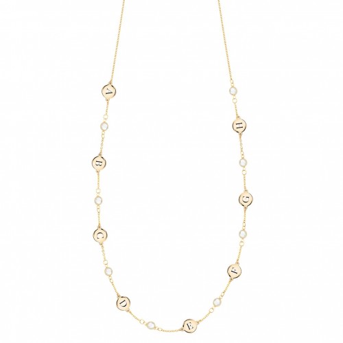Clean lines and high shine make this monogrammed gold disc necklace a modern classic. Six elegant initials engraved on both sides of solid 14k gold circular discs catch and reflect the light. Single spaced with lightweight chain, you can choose your children’s initials or other significant letters or write a word or name. Perfect for everyday wear – lightweight enough to sleep in and never take off. A staple for your everyday wardrobe – it layers beautifully with birthstone necklaces and the Adelaide Mini Necklace. A great mother or grandmother gift, it is easy to add on birthstones and letters so it can grow with your family!