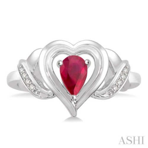 This gorgeous Ruby and diamond ring will surely touch her heart. Styled in luminous sterling silver this heart shape ring showcases a pear cut Ruby center stone diamond embellished by ‘v’ designed shank accentuated with 8 brilliant prong set round cut diamonds. The total diamond weight is 1/50 Ctw and Ruby measures 6×4 MM.