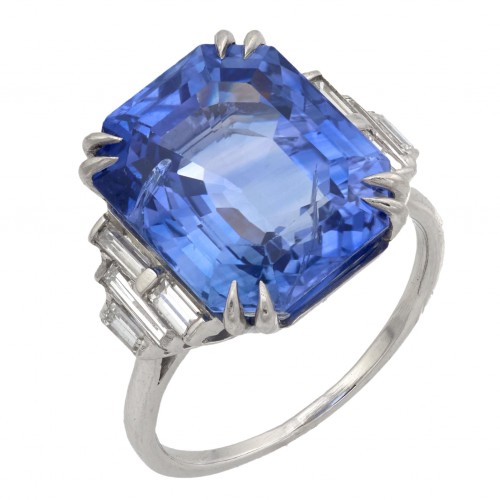 Elegant and timeless, this vintage platinum engagement ring showcases a striking 2.27 carat AIGS-certified sapphire of vivid blue hue from Madagascar. The emerald cut sapphire’s crisp lines and deep brilliance are complemented by two triangular cut diamonds that frame the center with luminous precision. Each diamond sparkles with exceptional clarity and balance, enhancing the geometric symmetry of the design. Crafted in platinum with meticulous detail, this 1990s ring embodies refined sophistication—a perfect harmony of color, form, and craftsmanship.