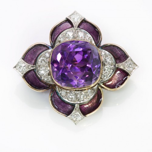 Marcus & Co. Antique 18K Gold Amethyst Diamond Enamel Brooch