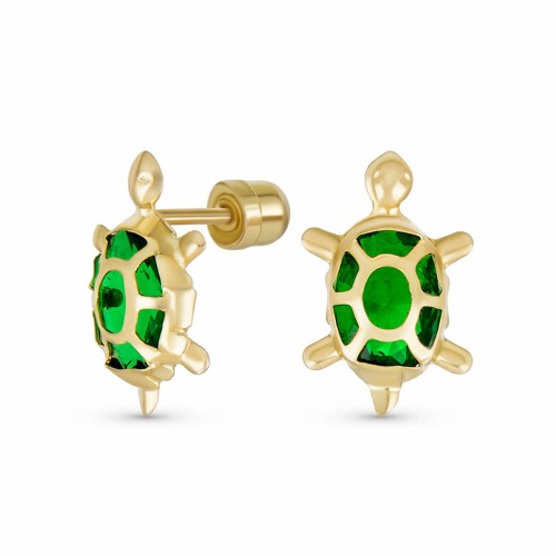 Petite Keepsake CZ Green Turtle Yellow 14K Gold Stud Earrings Secure Screw-back