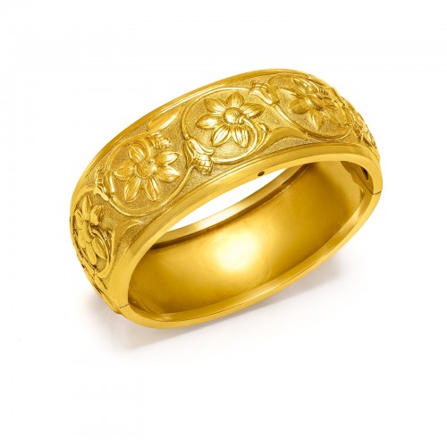 The surface features intricate, hand-engraved patterns that catch light with every movement, revealing the artisan’s mastery in shaping pure gold.