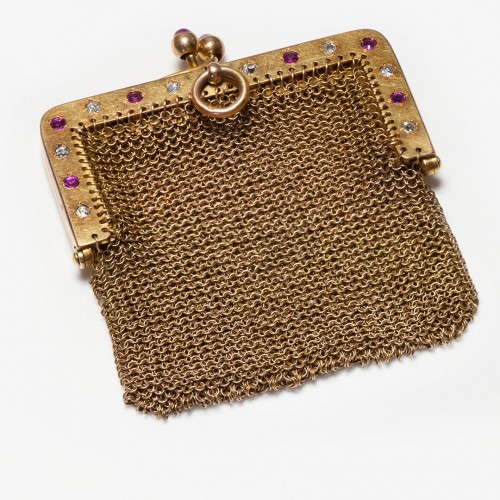 Antique 9K yellow gold miniature mesh purse set with diamonds, rubies and pearls.