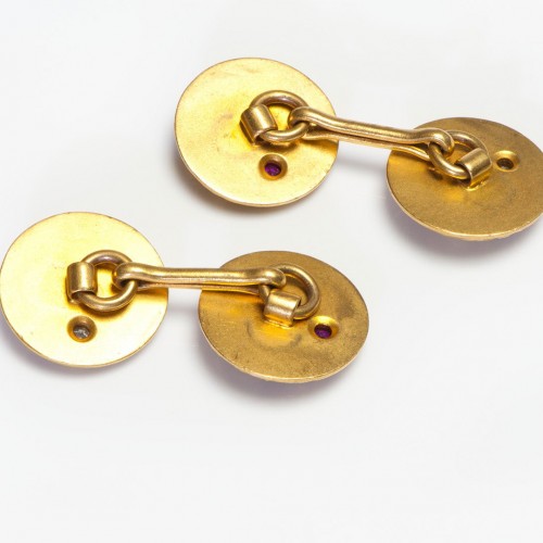 Each cufflink is set with a vivid ruby at its center, surrounded by sparkling diamonds that add a touch of brilliance. The intricate craftsmanship and harmonious blend of gemstones make these cufflinks an exceptional symbol of refined elegance, perfect for collectors or those seeking a distinctive accessory.