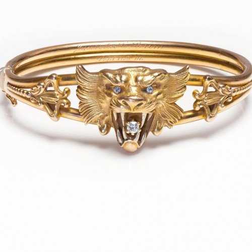 This exceptional Art Nouveau bangle bracelet is centered by a commanding griffin, exquisitely modeled in high-relief yellow gold. The creature’s outspread wings and intense gaze convey movement and strength, hallmarks of Art Nouveau design inspired by mythology and nature. Two small diamonds form the griffin’s eyes, while a larger diamond is set within the open mouth, creating a striking focal point with subtle brilliance.