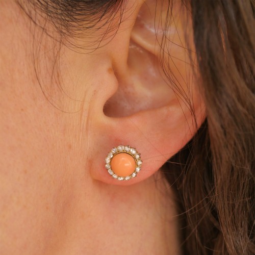 These Edwardian era earrings feature two 5mm round corals and thirty natural round rose cut diamonds weighing approx 1.00 ctw. Posts are screw backs. Set in 18k yellow gold. Will come with an independent appraisal. Edwardian, Circa 1900.