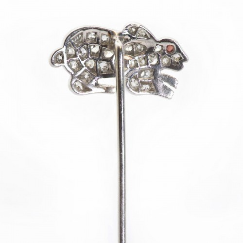 This delightful antique stick pin features a whimsical rabbit design, exquisitely crafted in platinum and adorned with sparkling diamonds. A testament to early 20th-century artistry, the intricate detailing captures the charm and elegance of the era.