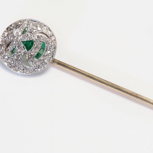 This antique Edwardian platinum emerald diamond stick pin exemplifies the opulent design of the early 20th century.