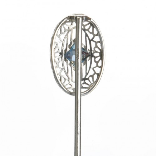 This antique filigree gold aquamarine stick pin showcases exquisite craftsmanship from a bygone era.