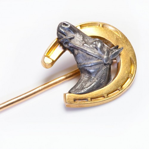 This antique French 18K gold horse horseshoe stick pin combines the charm of classic equestrian themes with fine French craftsmanship.