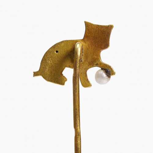 The Antique French 18K gold pearl cat kitty stick pin is a charming and whimsical piece that captures the essence of early 20th-century French jewelry artistry.