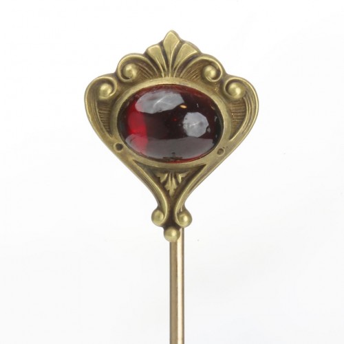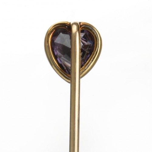 This Antique Gold Amethyst Diamond Heart Stick Pin showcases a beautifully cut heart-shaped amethyst, set in gleaming gold.
