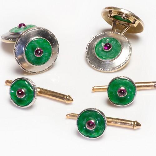 Gold Platinum Carved Jade Ruby Cufflink Stud Set