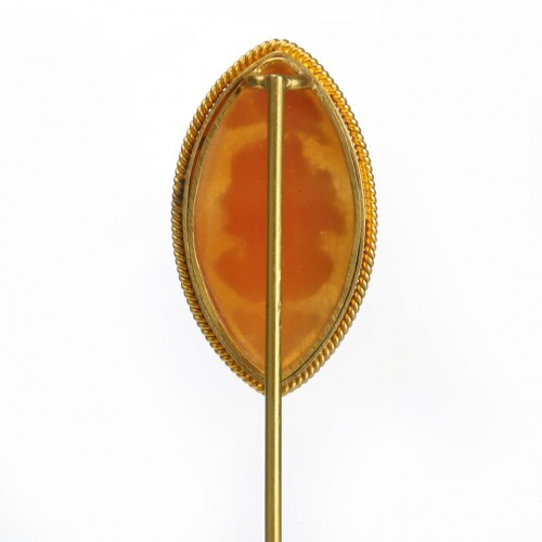 The antique gold carved shell cameo stick pin offers a glimpse into a bygone era with its intricate craftsmanship and classic appeal.