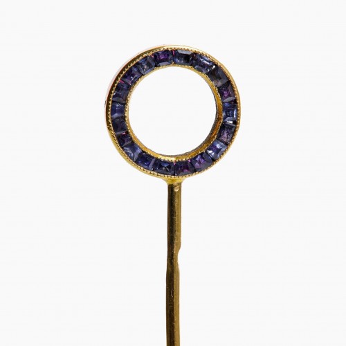 This extraordinary piece features a circular design encrusted with small, dazzling rubies on one side and vibrant sapphires on the other. Crafted from luxurious antique gold, this versatile stick pin offers two striking looks in one elegant accessory.