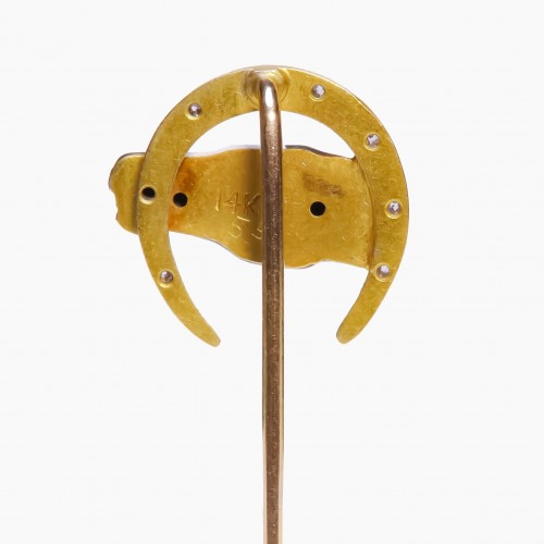 The antique gold enamel diamond horseshoe horse stick pin blends classic elegance with a touch of whimsy.