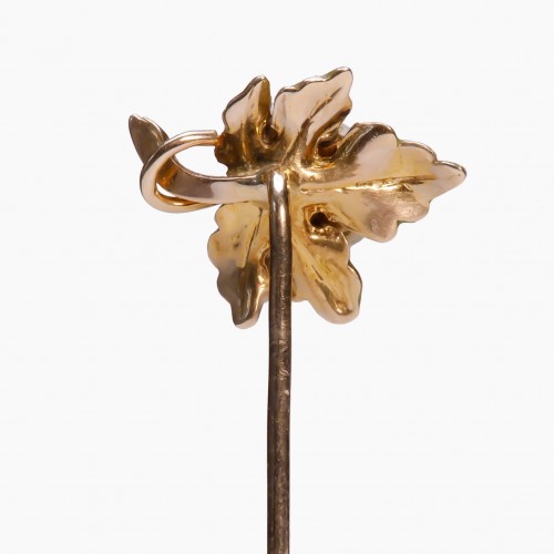 The antique gold enamel pearl leaf stick pin beautifully merges natural elegance with vintage sophistication.