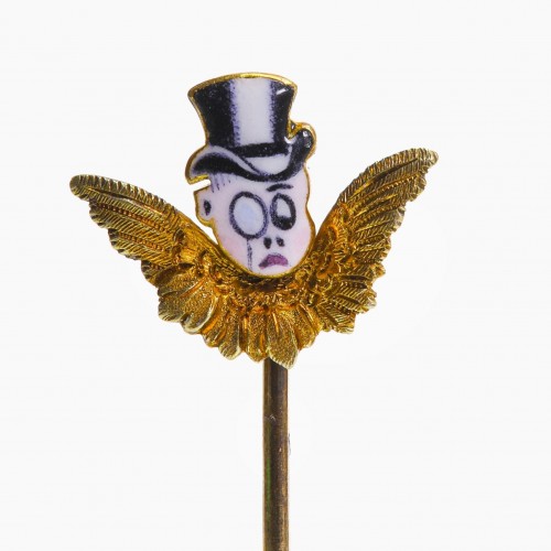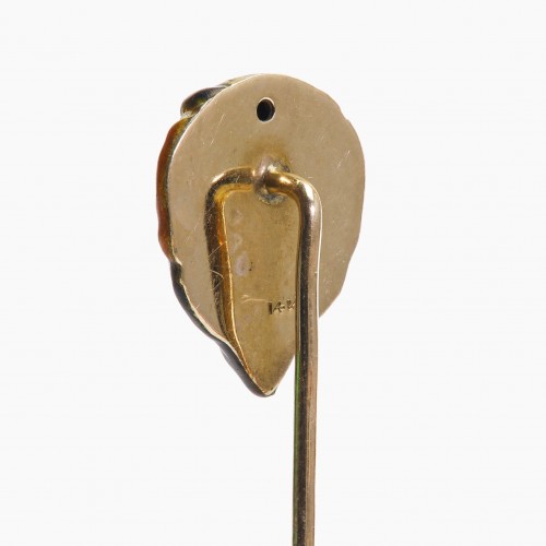 Featuring an intricately detailed satyr motif crafted in antique gold, this pin showcases rubies set as the satyr’s eyes, adding a striking pop of color. The vibrant enamel accents enhance the design’s depth and sophistication, making this stick pin a unique accessory that blends artistic charm with luxurious details.