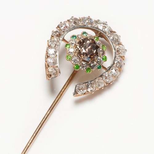 Embrace luck and luxury with the antique gold fancy brown diamond & old mine diamond horseshoe stick pin.